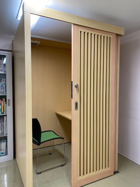 湘北短期大学様のEDOブース導入例を紹介いたします。 学生が企業とのweb面接などに利用できる個室ブースとして、弊社のEDOブースを導入頂きました。 ブースの中が確認できるようにドアの格子の間