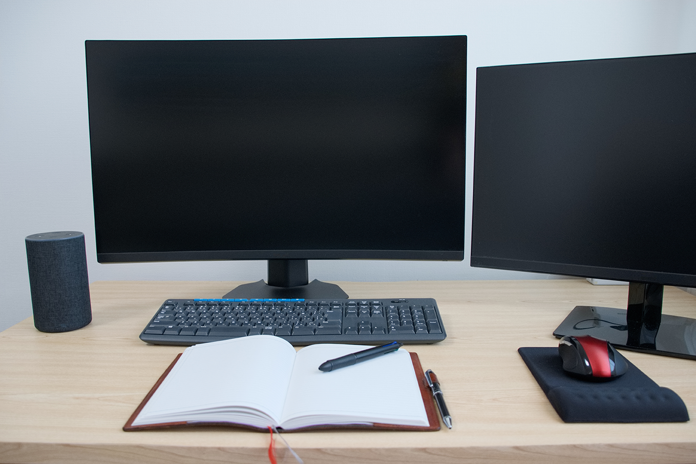 L字型のデスクだとさらにもう一台モニターを設置できるほか、十分な作業用のスペースを確保することもできます。